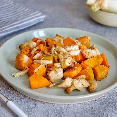 5. 烤制:将腌制好的鸡肉和帝瓜块放入烤盘中,放入预热至200度的烤箱中,烤制20分钟。